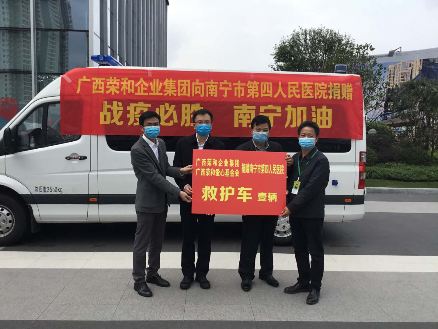 在當(dāng)時(shí)醫(yī)療物資較為緊缺的情況下,通過多方聯(lián)系,成功采購了4輛福田圖雅諾醫(yī)療負(fù)壓救護(hù)車和其他醫(yī)療設(shè)施(總價(jià)值140萬元),并與廠家積極配合,一路風(fēng)雨兼程將救護(hù)車第一時(shí)間捐贈(zèng)到南寧市第四人民醫(yī)院、柳州市人民醫(yī)院、桂林市第三人民醫(yī)院、北海市人民醫(yī)院的抗疫一線。