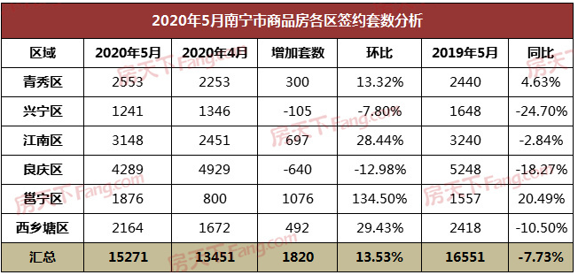 從各區(qū)域表現(xiàn)來看,良慶區(qū)熱度不減,以4289套房源文具成交套數(shù)榜首,江南區(qū)排行第二,成交3148套;青秀區(qū)成交2553套擠進前三位置。