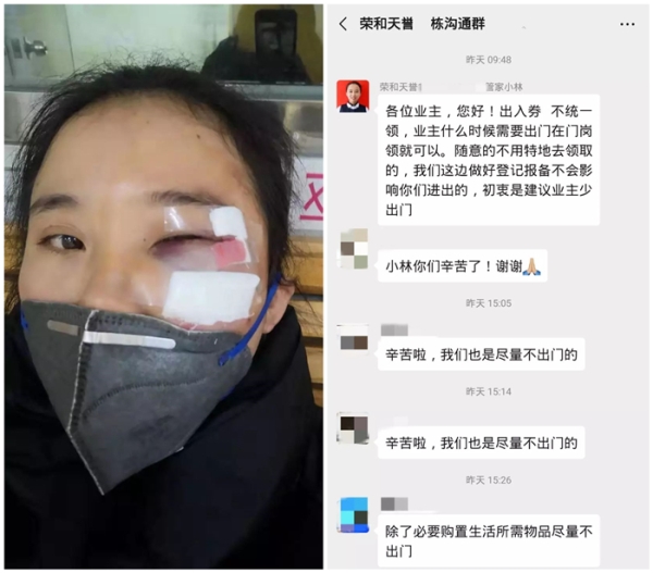 2月6日柳州下著大雨,林小玲騎電單車上班途中因路面濕滑摔倒,左臉劃傷縫了11針,需在家休養(yǎng),但她仍堅持在線及時回復各種咨詢,為業(yè)主協(xié)調(diào)解決問題。2月13日傷口拆線后,林小玲在第一時間就返回了崗位,積極投身工作。